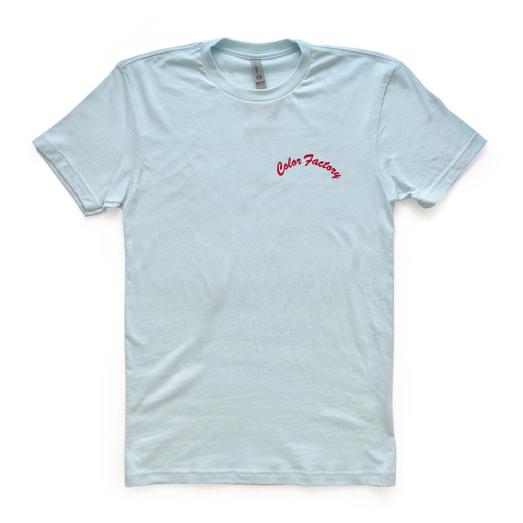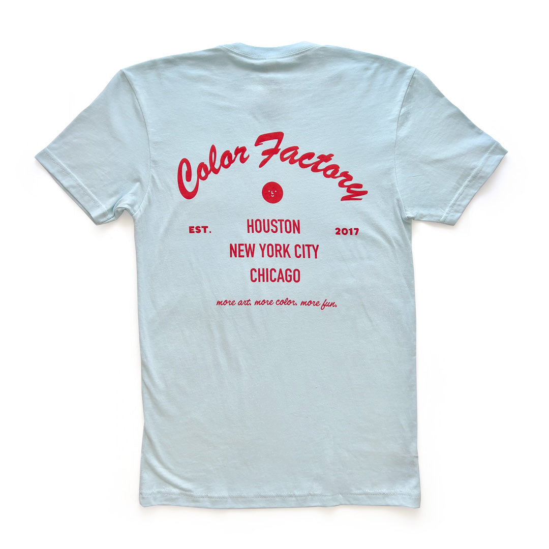 Soon to be your new favorite t-shirt! Our Light Blue Color Factory t-shirt features a vibrant red screen print highlighting our 3 locations - Houston, New York City, and Chicago.