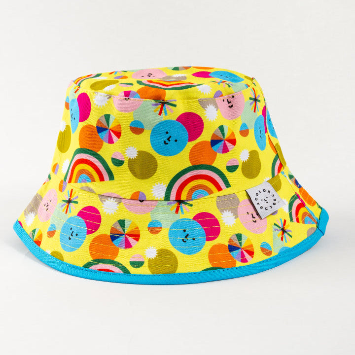 Brighten up their day with our youth bucket hat. With its vibrant yellow hue, contrast blue trim, and cheerful prints with Color Factory's favorite icons - it's the ultimate accessory for spreading smiles and making everyday a celebration!