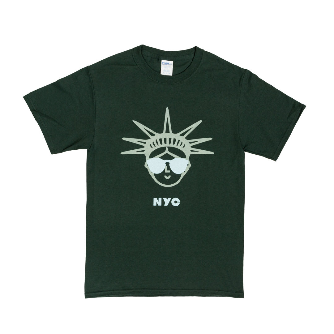 New York City's most famous icon got a Color Factory makeover! Lady Liberty, screen printed in mint green on the comfiest dark green tee, wears a blue pair of classic sunglasses. If you wear this around town, you're sure to get smiles wherever you go!