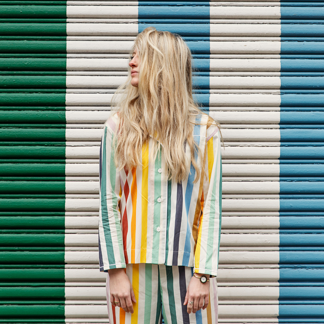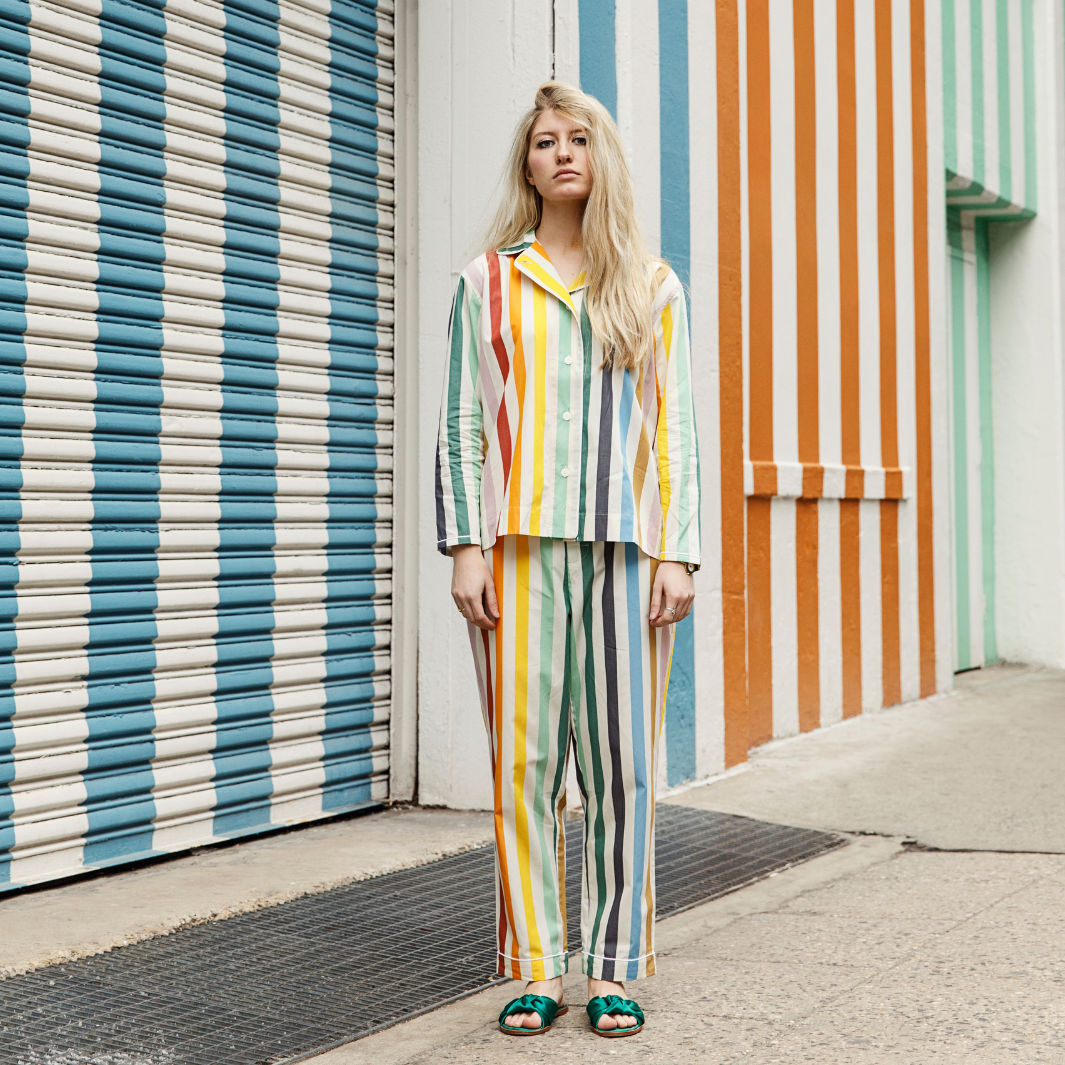This collaboration with Sleepy Jones turned our NYC color palette into the perfect pajamas. Long-sleeve shirt with chest pocket, a five-button placket and piping details, and cropped, cuffed button-fly pants with an elastic waist, two side pockets, one back pocket, and cuff details.