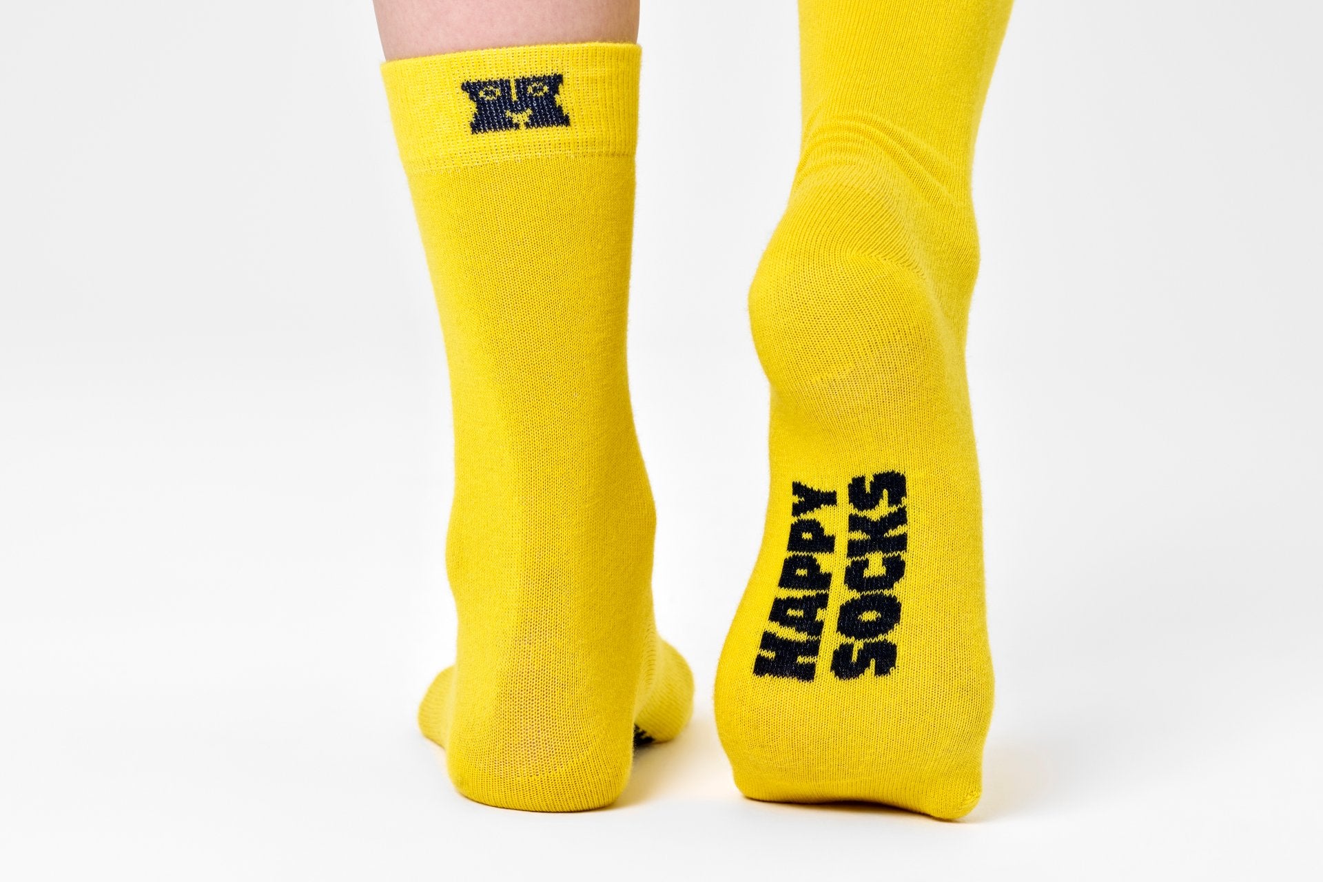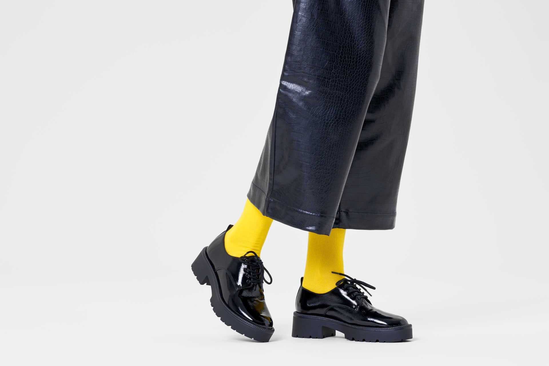 Make a statement. This modern crew style in one solid color (yellow in this case) sits just below mid calf. Made from soft and breathable organic combed cotton.